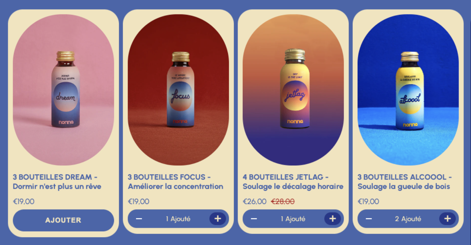 J’ai fait parti de l’équipe NonnaLab et mis en place leur eshop pendant 2 ans. Alcoool et les autres boissons aux pouvoirs magiques. Certaines enlèvent la gueule de bois ou d’autres qui permettent de mieux dormir, d’avoir un coup de boost le matin, pour mettre en avant tout ces bienfait dans un graphisme aussi pop que l’explosion de ventes qu’ils ont fait pendant cette periode.